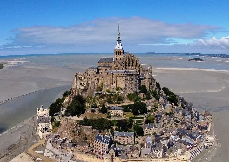 Imponente abadía medieval erigida sobre un peñón rocoso en Normandía, famosa por su arquitectura gótica, leyendas angélicas y las extremas mareas que la rodean.